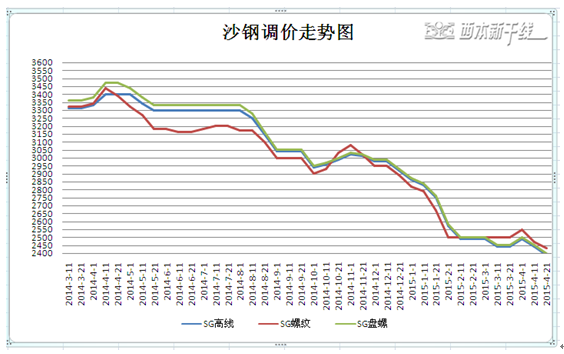 下圖為2014年3月11日-2015年4月21日沙鋼建筑鋼材調(diào)價(jià)走勢(shì)圖