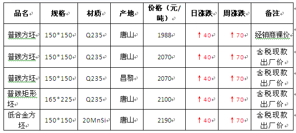 新干線(xiàn)訊:24日午盤(pán),唐山方坯報(bào)價(jià)上漲40元/噸。現(xiàn)昌黎宏興,唐山興隆、唐山國(guó)義等普碳方坯現(xiàn)金含稅價(jià)為2070元/噸,普碳矩形坯現(xiàn)金含稅價(jià)為2100元/噸,低合金方坯20Mnsi現(xiàn)金含稅價(jià)2190元/噸。