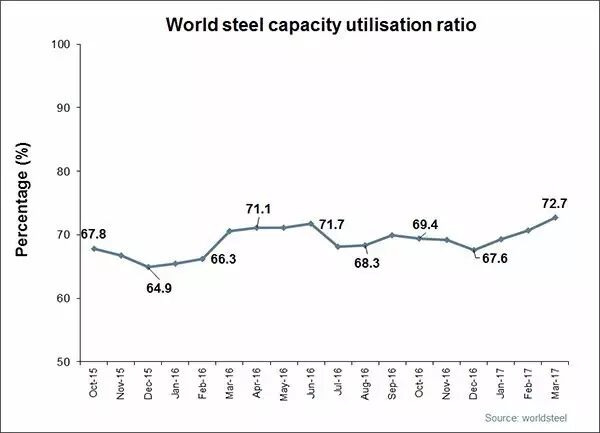 2017年3月全球67個(gè)國(guó)家的粗鋼產(chǎn)能利用率為72.7%,同比提高2.2個(gè)百分點(diǎn),環(huán)比提高2.0個(gè)百分點(diǎn)。