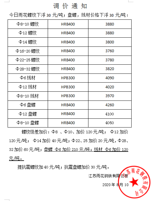 8月10日江蘇雨花對(duì)建筑鋼材價(jià)格調(diào)整信息