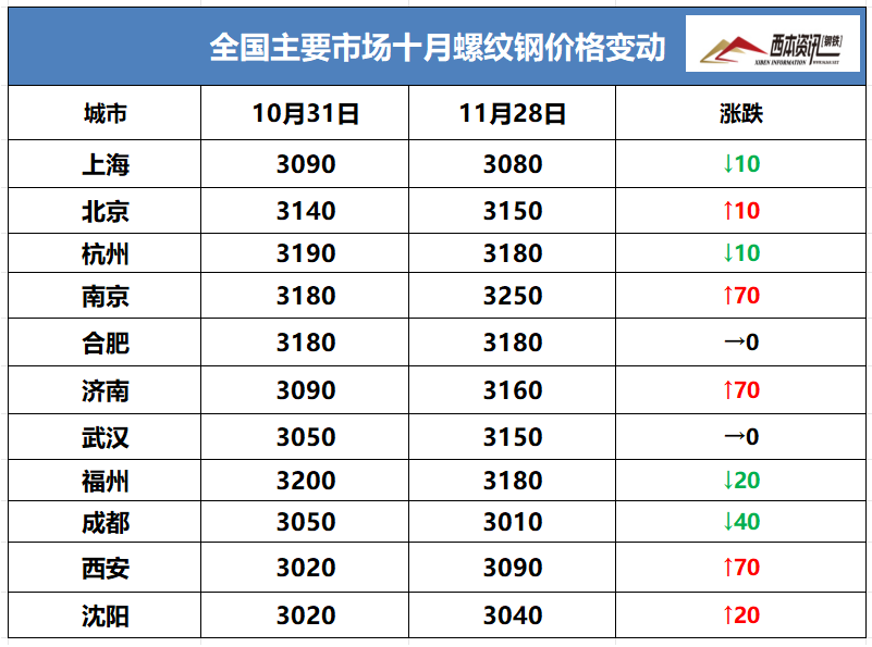 據(jù)西本資訊跟蹤的數(shù)據(jù)顯示,截止11月27日,唐山地區(qū)普碳方坯出廠價格2980元/噸,較上月同期持平;江蘇地區(qū)廢鋼價格為2050元/噸,較上月同期下降50元/噸;山西地區(qū)一級焦炭價格為1430元/噸,較上月上漲100元/噸;澳大利亞61.5%粉礦青島港價格為796元/噸,較上月同期下降6元/噸。