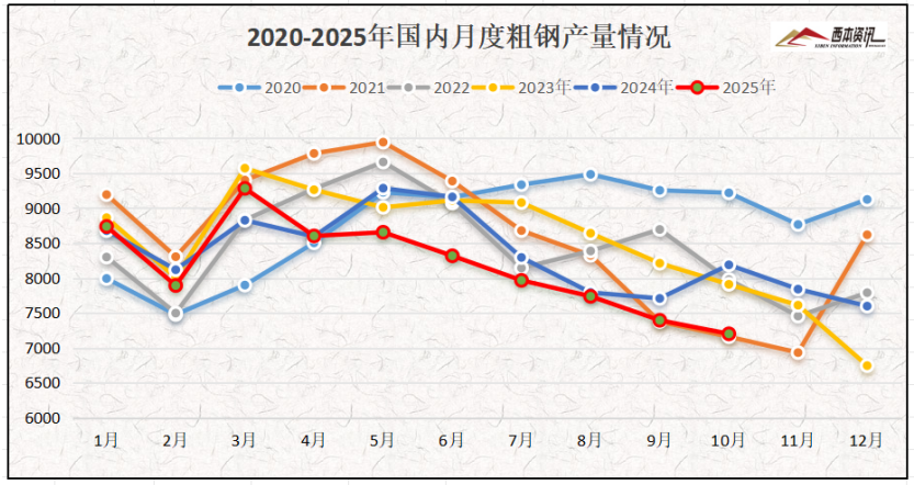 從鋼廠生產(chǎn)情況來看,國家統(tǒng)計局?jǐn)?shù)據(jù)顯示,2025年10月,中國粗鋼產(chǎn)量7200萬噸,同比下降12.1%;生鐵產(chǎn)量6555萬噸,同比下降7.9%;鋼材產(chǎn)量11864萬噸,同比下降0.9%。1-10月,中國粗鋼產(chǎn)量81787萬噸,同比下降3.9%;生鐵產(chǎn)量71137萬噸,同比下降1.8%;鋼材產(chǎn)量121759萬噸,同比增長4.7%。