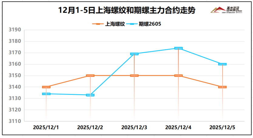 (2)周初,期螺合約大幅拉升,終端需求加大采購,市場情緒好轉(zhuǎn),鋼價小幅抬高,周中,期螺主力合約更換,需求表現(xiàn)一般,市場報價維持平盤,臨近周末,空頭打壓稍站上方,現(xiàn)貨報價略有松動。截至12月5日,螺紋2605主力合約報在3160,周環(huán)比上漲50。