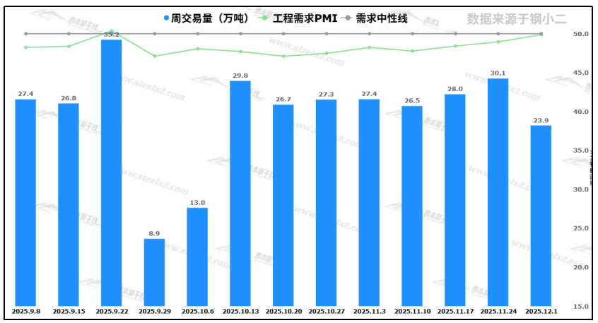 本周初,受期螺盤面大幅拉升,市場交易增量,多地鋼價小幅探漲。周中至周五,盤面合約上下波動,終端按需采購,各地交易維持低位。另外,隨著冬季深入,北方需求逐步減量,少數(shù)北方地區(qū)鋼價小幅下跌。據(jù)鋼小二跟蹤數(shù)據(jù)顯示,截至周五下午15點,本周采樣全國工程需求量23.9萬噸(注:本周六和周日數(shù)據(jù)暫未錄入)。