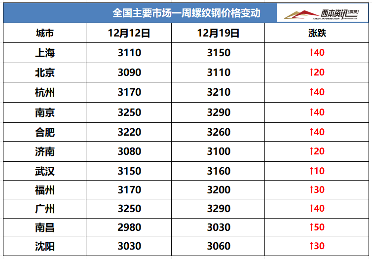 (1)上周?chē)?guó)內(nèi)建筑鋼材行情小幅上漲,截至12月19日,西本指數(shù)報(bào)在3510,周環(huán)比上漲30。