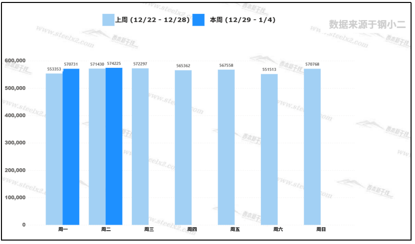 據(jù)鋼小二平臺樣本數(shù)據(jù),12月30日建筑鋼材社會庫存量為574,225噸,較前一交易日庫存增加0.6%。